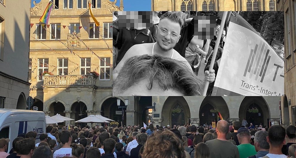 Beim CSD in Münster wollte Malte C. eine Gruppe Frauen vor Beleidigern schützen. Dann wurde er niedergeschlagen, kam mit Hirnblutung ins Krankenhaus, wo er am 2.9.22 starb. – Wie das alles begann und was nun notwendig ist, sagt Jens Brüggemann (CSD-Verein Münster) im Interview. – Foto von der Kundgegung in Münster am 2.9. von Ruprecht Polenz / twitter, Trans*-Inter*-Münster e.V.