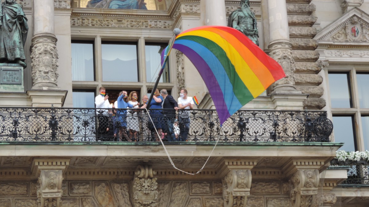 Ab dem 27.7.2020 flattert die Regenbogenflagge am Hamburger Rathaus, gehisst von der Zweiten Bürgermeisterin Katharina Fegebank.