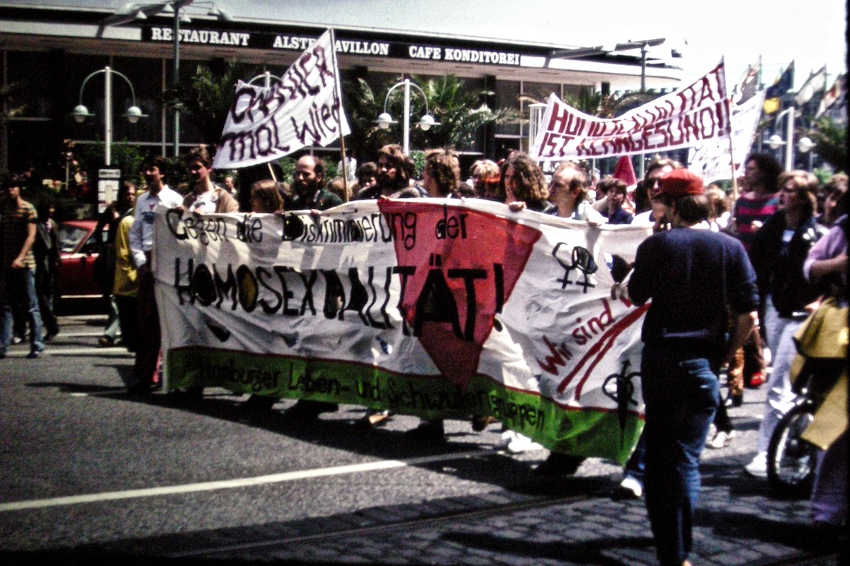 Thomas Grossmann erinnert sich an die 1970er-Jahre. Was waren die Probleme für schwule Männer und was wollte die Homosexuelle Aktion Hamburg (HAH) damals erreichen? – Foto von 1980: Thomas Grossmann links am Transparent. Fotograf: Bernd Leichauer