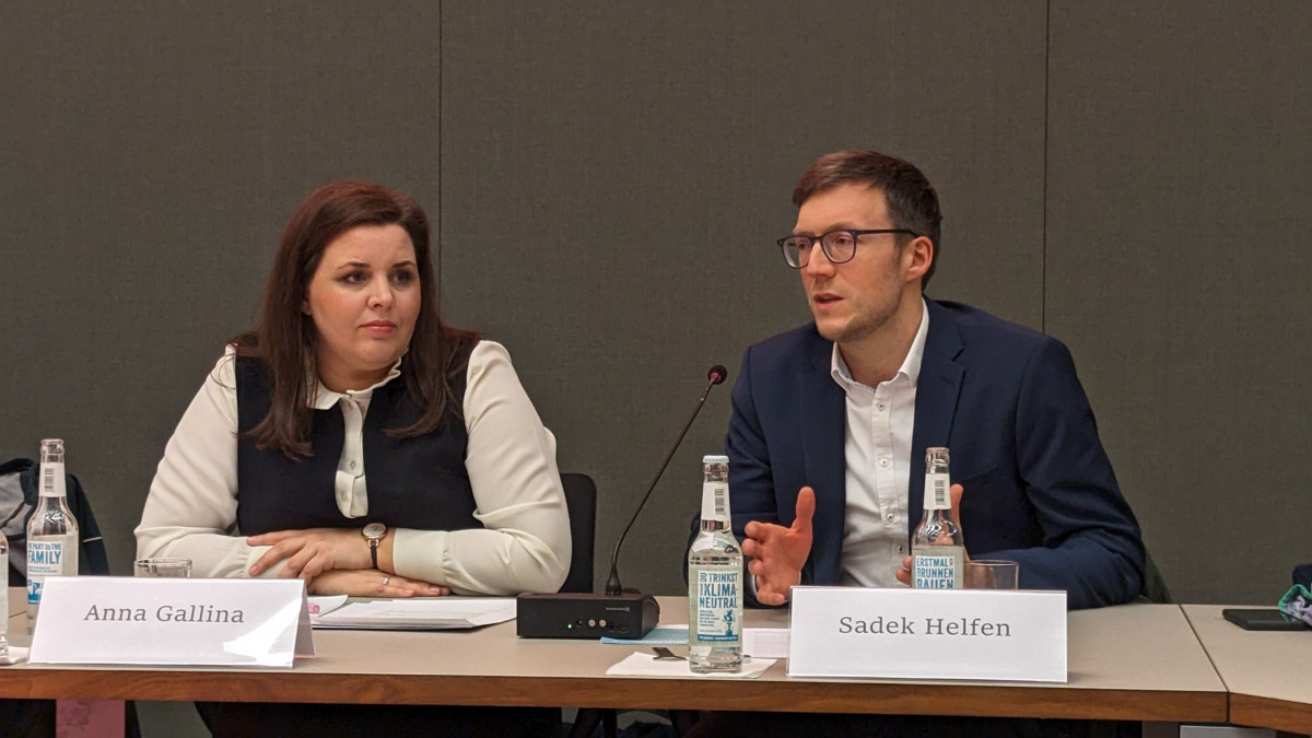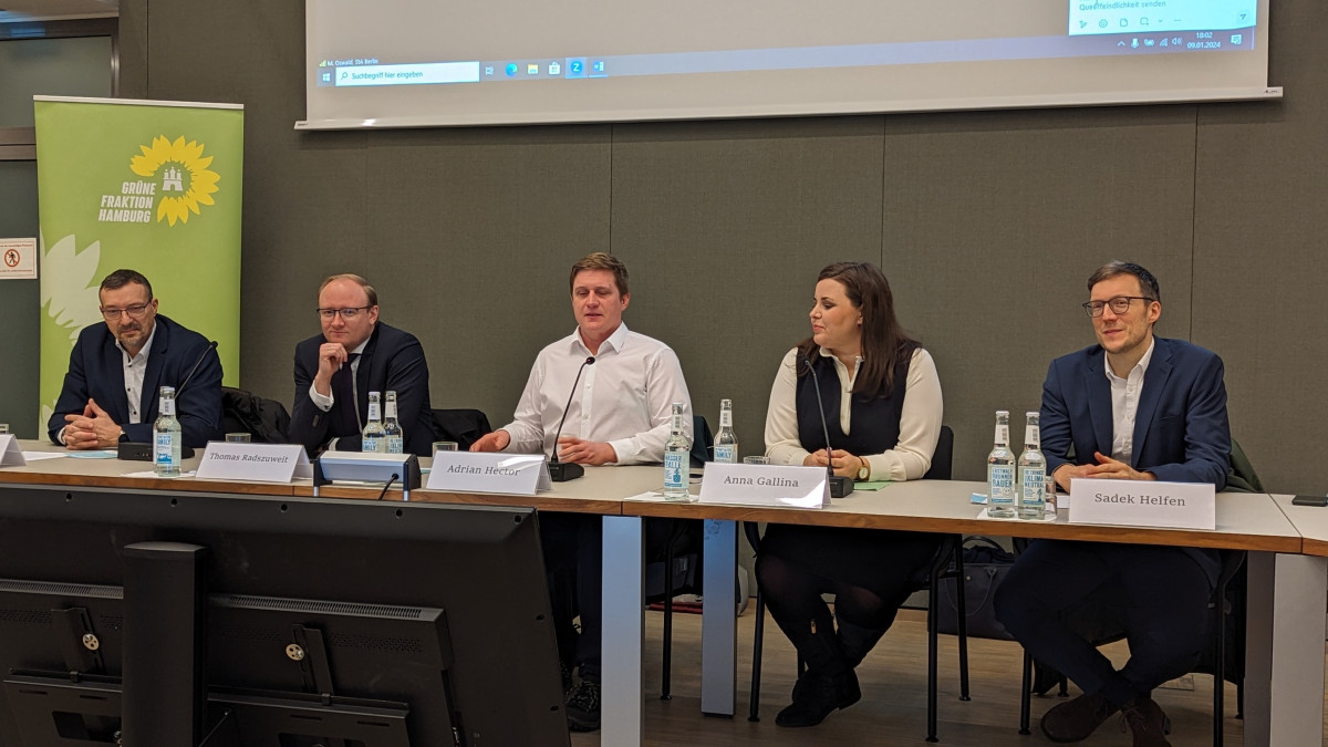 Bei der Veranstaltung „Gemeinsam gegen Queerfeindlichkeit“ erläuterte die Justizsenatorin Anna Galina (Grüne), wie sie die Community unterstützen möchte (Foto 2.v.re). – Eingeladen hatte Adrian Hector, Sprecher für geschlechtliche Vielfalt (Foto Mitte).