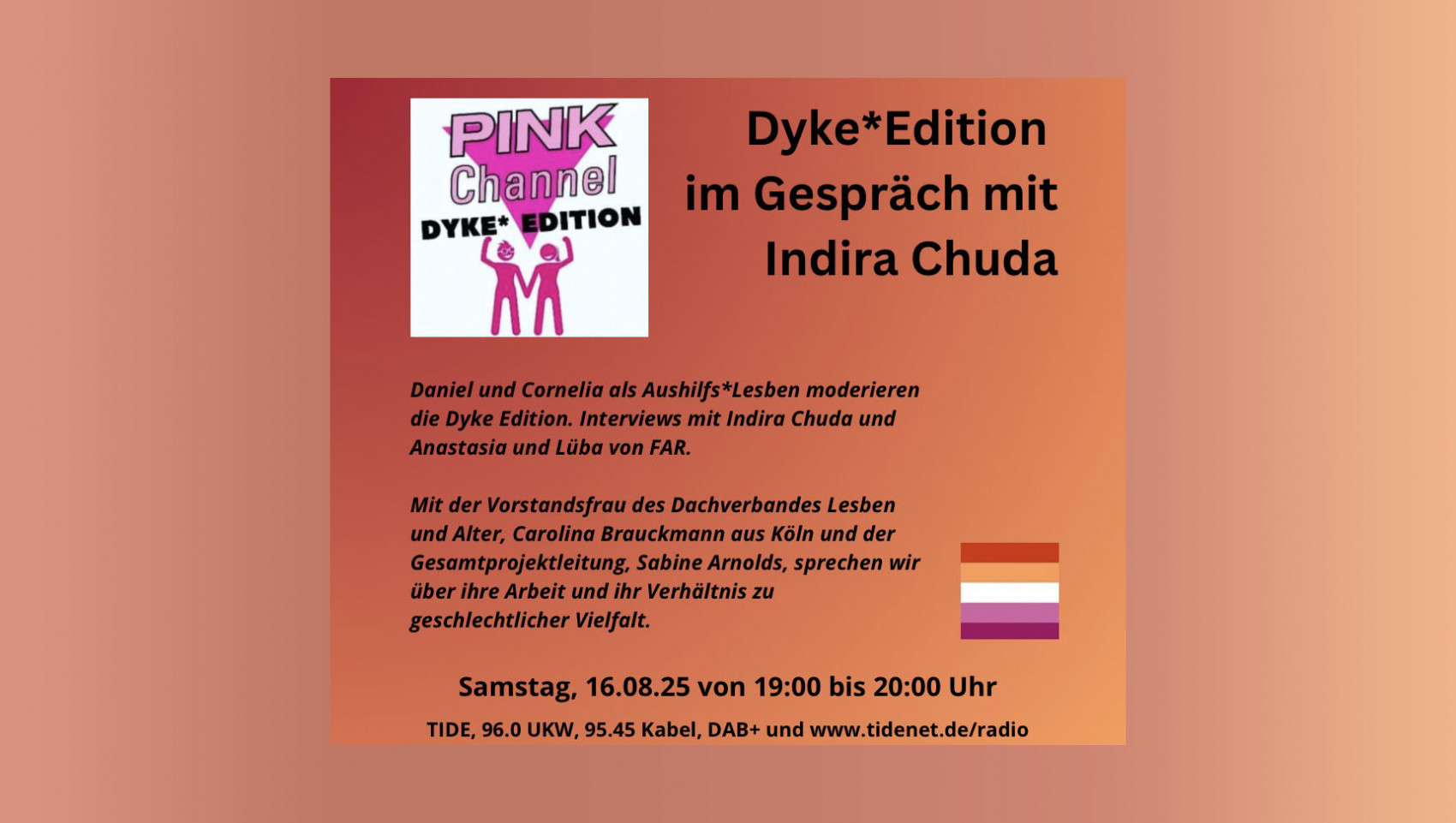 Dyke*Edition im Gespräch mit Indira Chuda. Daniel und Cornelia als Aushilfs*Lesben moderieren die Dyke*Edition. Interviews mit Indira Chuda und außerdem Anastasia und Lüba von FAR. Mit der Vorstandsfrau des Dachverbandes Lesben und Alter, Carolina Brauckmann aus Köln und der Gesamtprojektleitung, Sabine Arnolds, sprechen wir über ihre Arbeit und ihr Verhältnis zu geschlechtlicher Vielfalt.
