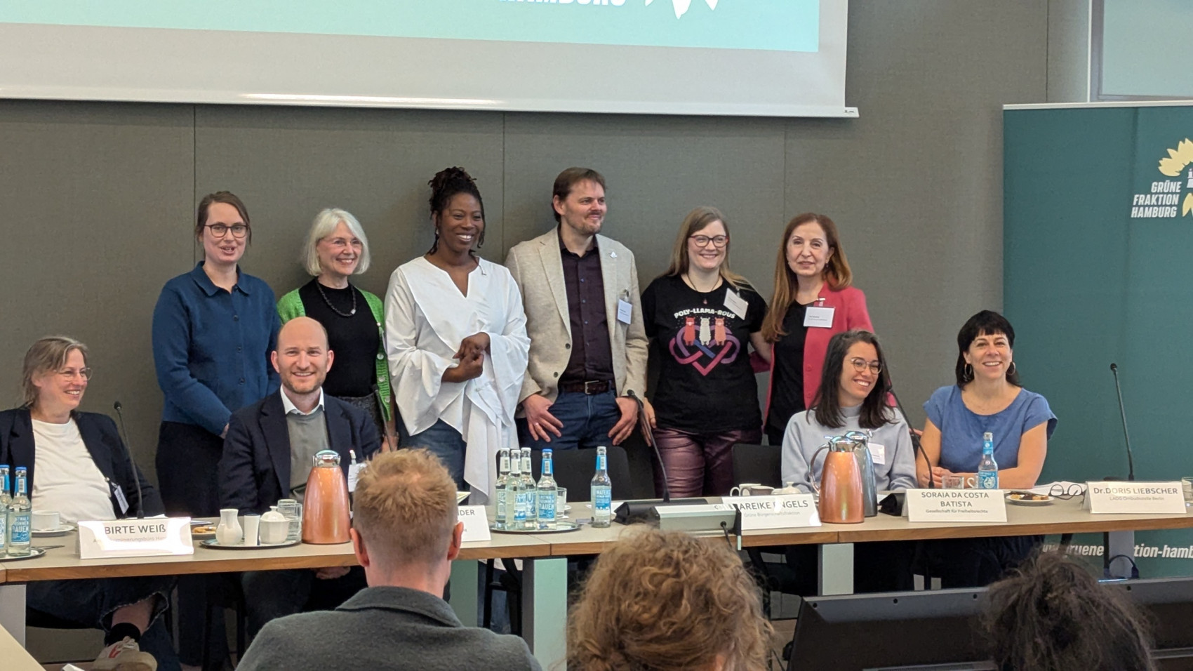 Nach dem Berliner Vorbild soll Hamburg in dieser Legislatur ein Landes-antidiskriminierungsgesetz (LADG) mit zugehöriger Ombudsstelle bekommen. Von Berliner Erfahrungen berichtete u.a. die Leiterin der Berliner Ombudsstelle Doris Liebscher. Zentrale Rolle in Berlin spielt dabei die Ombudsstelle, die Beschwerden prüft, berät und Schlichtungsverfahren begleitet. Viele Fälle betreffen das Behördenhandeln – etwa Bezirksämter, Verkehrsbetriebe oder Schulen. Konkrete Beispiele zeigen, wie sich durch Klagen und Schlichtungen Verwaltungspraxis verändern kann. Auch Hamburg plant ein Landesantidiskriminierungsgesetz – eine Auftaktveranstaltung der Grünen markierte den Beginn der Debatte. – Foto: v.l.n.re: Birte Weiß, Mareike Engels, Alexander Tischbirek, Mechthild Weber, Irene Appiah, Michael Gwosdz, Miriam Block, Filiz Demirel, Soraia Da Costa Batista, Doris Liebscher.